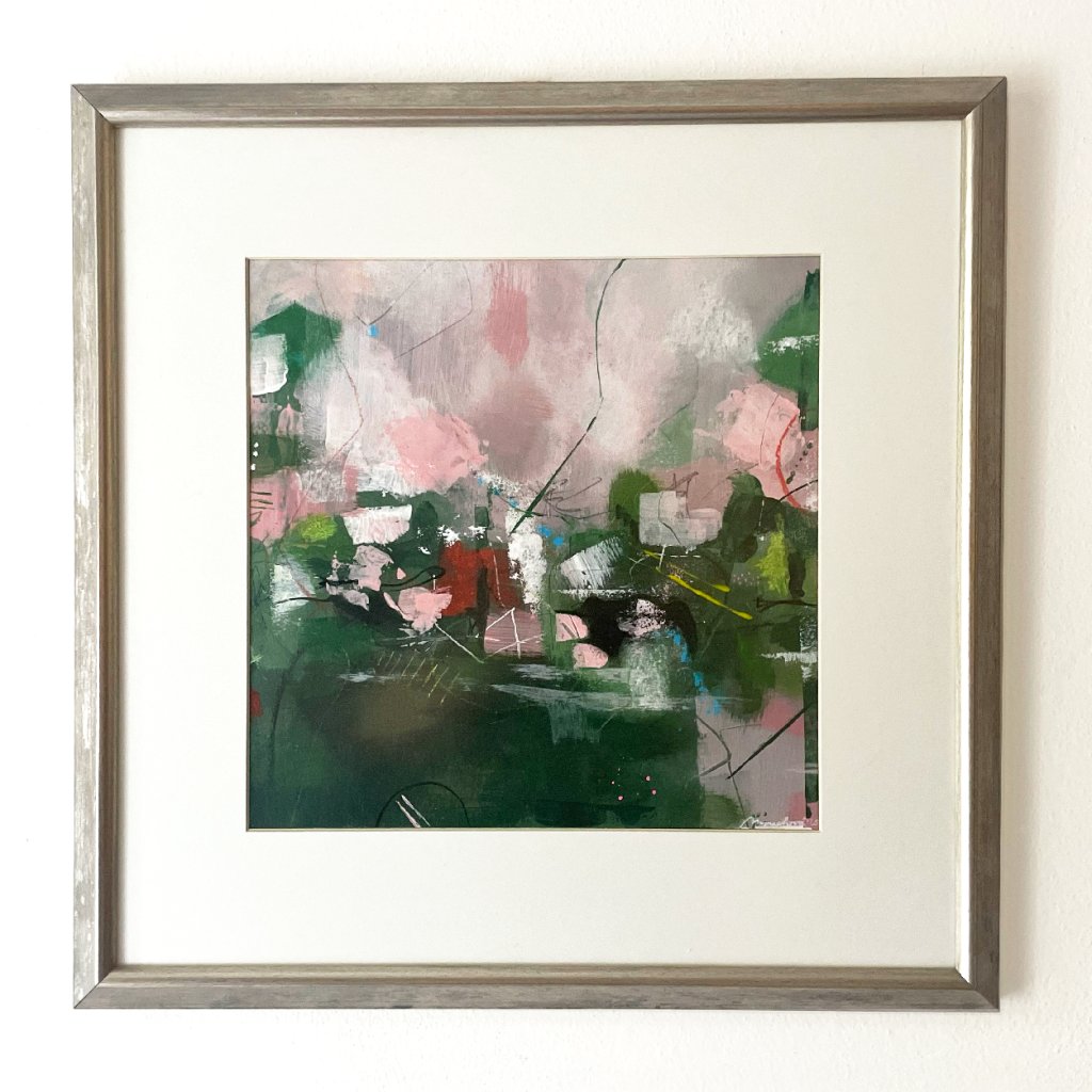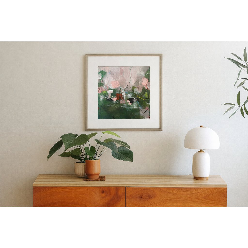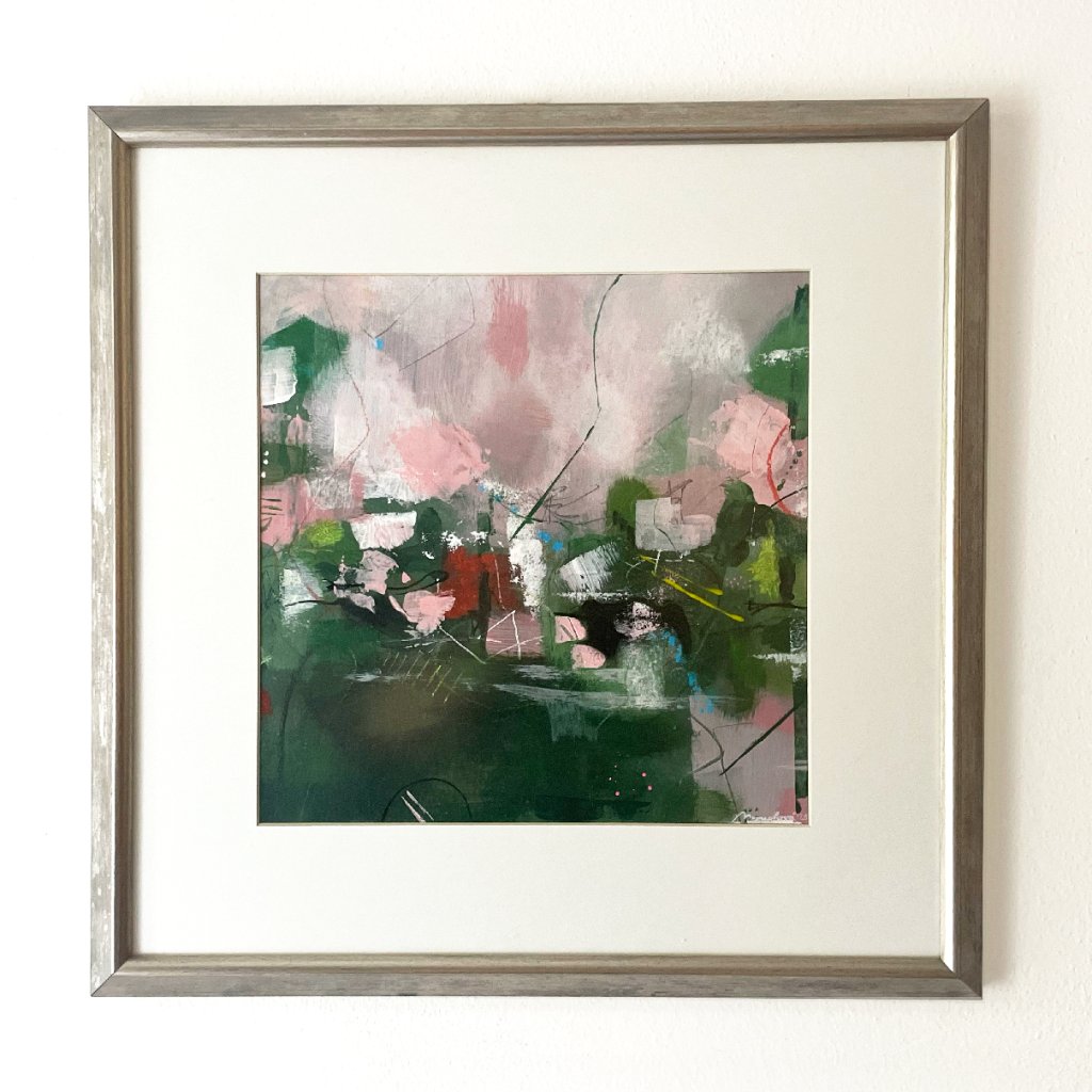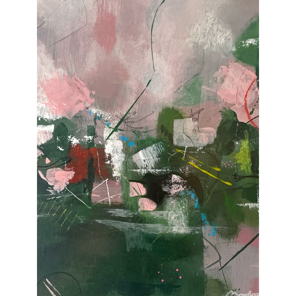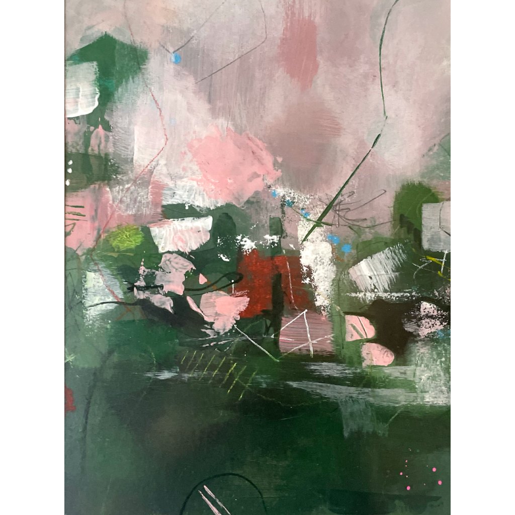 Abstraktní obraz pracuje s vyváženou kompozicí tlumených zelených tónů, doplněných jemnými růžovými, šedými a bílými plochami. Vrstvená malba kombinuje krycí i transparentní tahy, čímž vytváří pocit hloubky a prostorovosti. Kontrast mezi tmavší spodní částí a světlejším horním polem přirozeně vede divákův pohled napříč kompozicí.